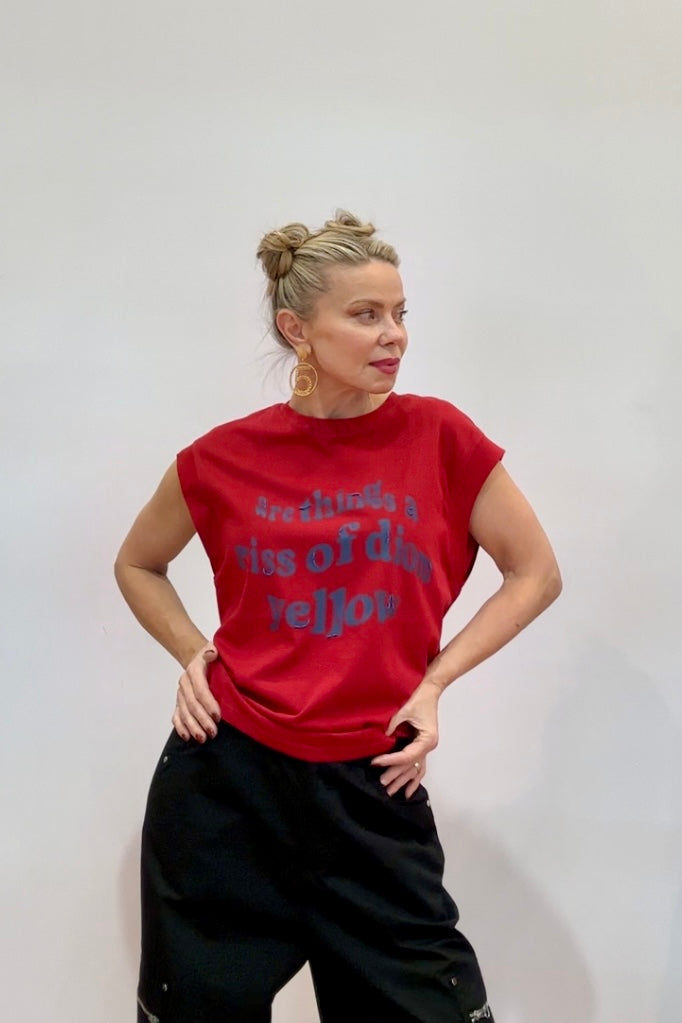 Turn heads in the Crimson Statement Tee — a chic yet relaxed piece that blends comfort with confident femininity. Cut in a soft, drapey silhouette with subtle cap sleeves, this tee brings effortless attitude to your everyday edit. The deep red hue makes a bold statement, while the tonal blue text print adds an artful, contemporary touch.
