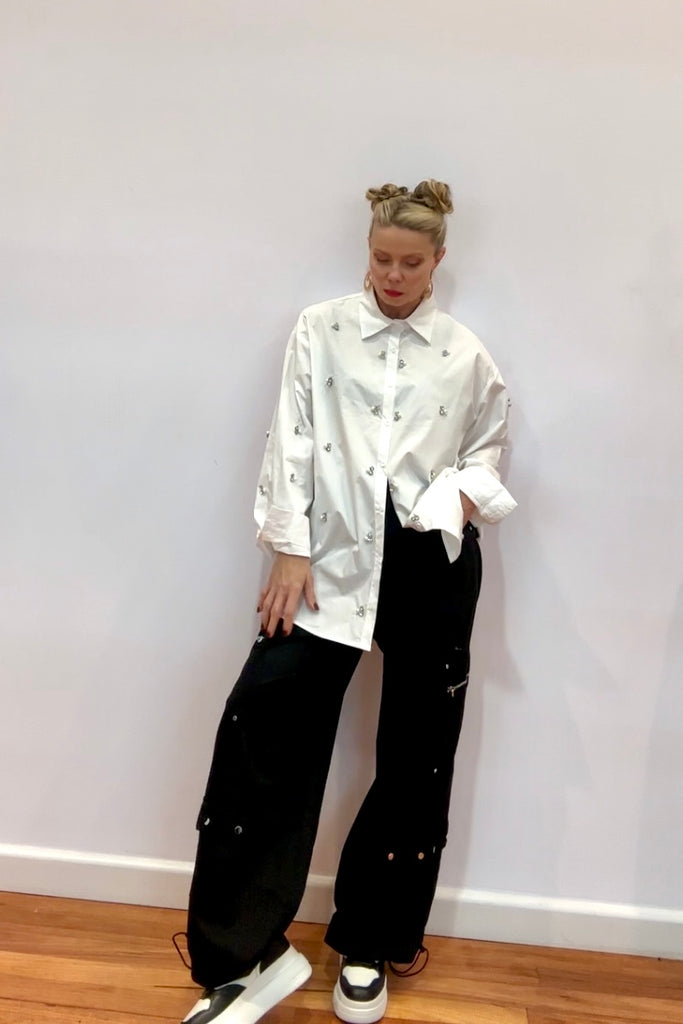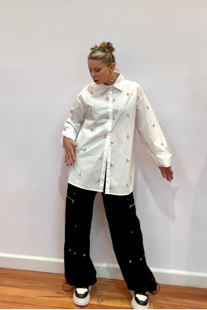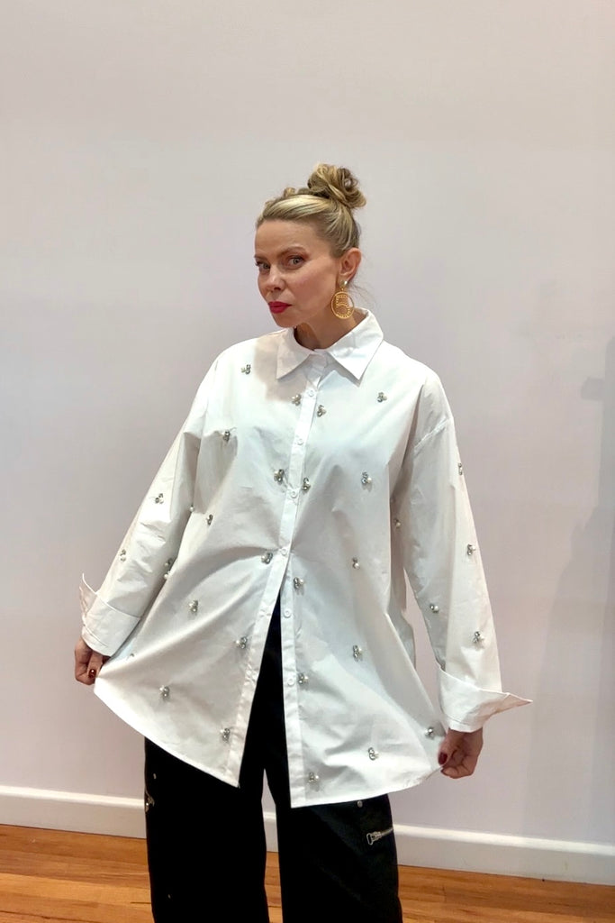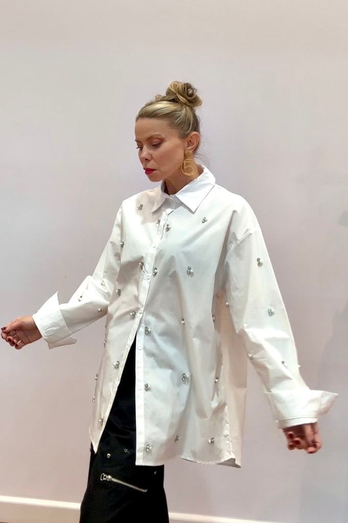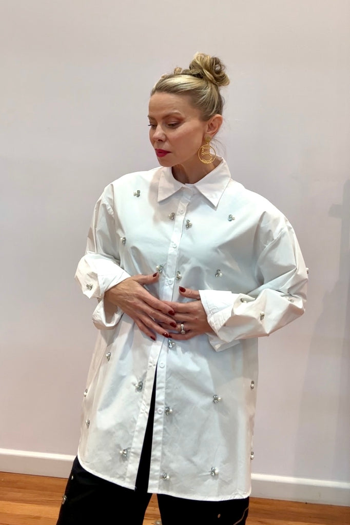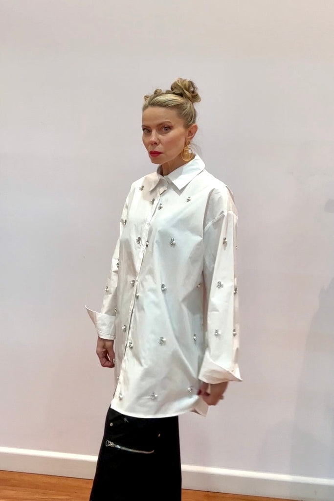 Add a touch of glamour to your classic white shirt moment with the Crystal Bee Oversized Shirt — where timeless tailoring meets playful sparkle. Adorned with delicate crystal-embellished bee motifs throughout, this shirt captures the perfect balance of crisp structure and feminine detail.