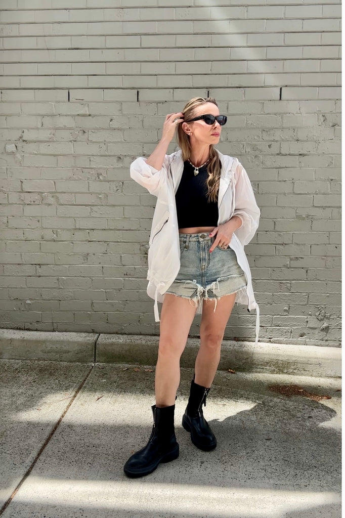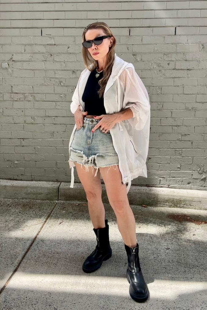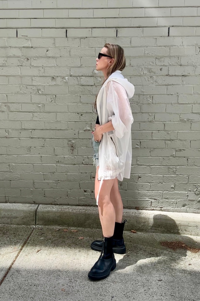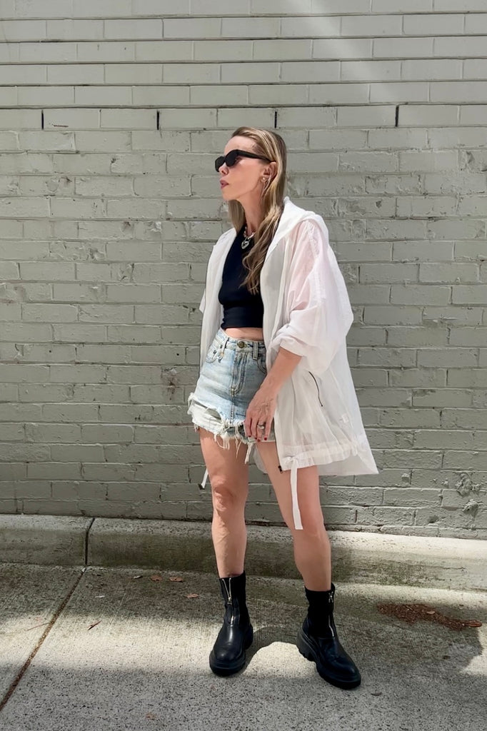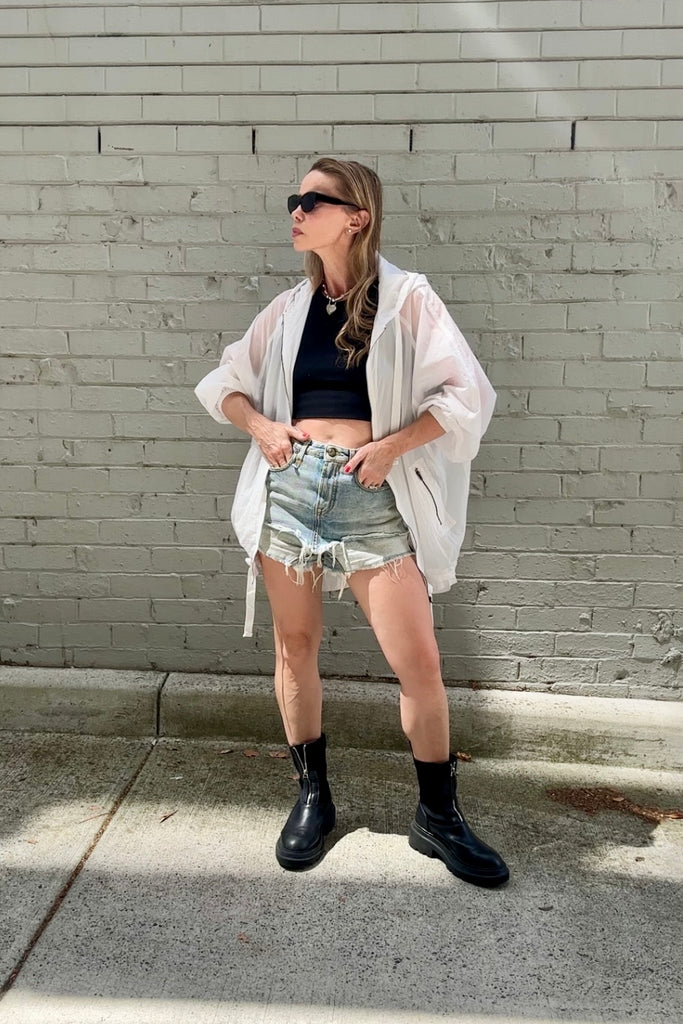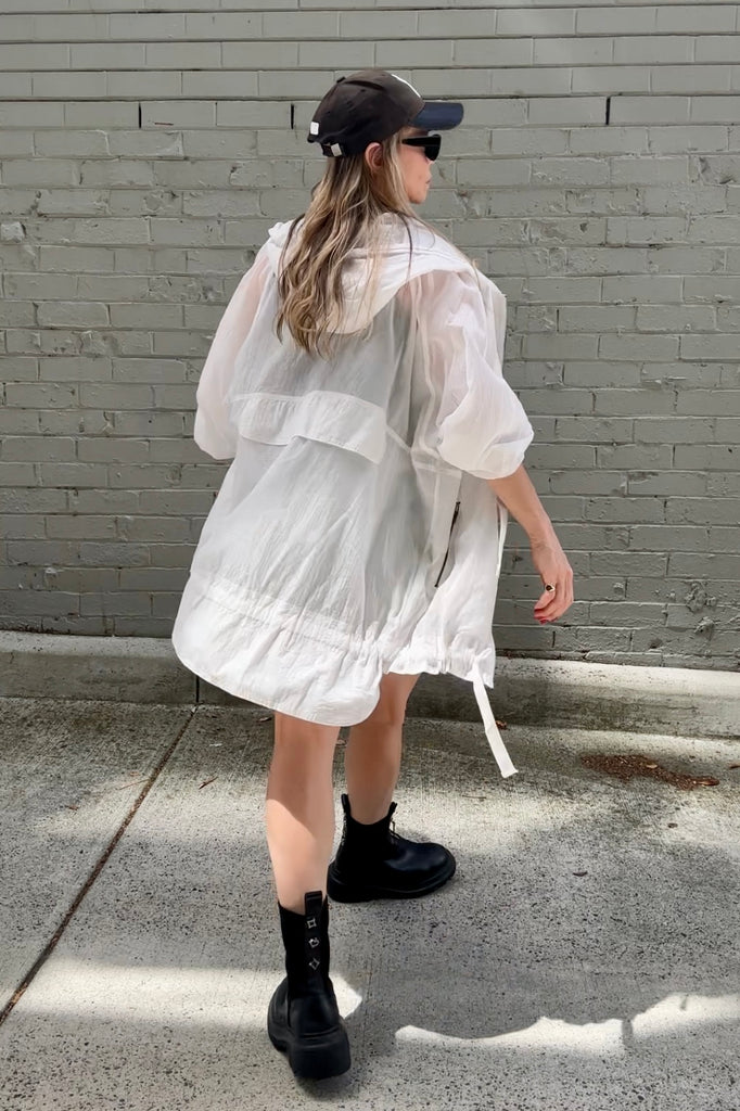 Street style light weight windbreaker jacket with hood , zip-front and decorative pocket on the back.
