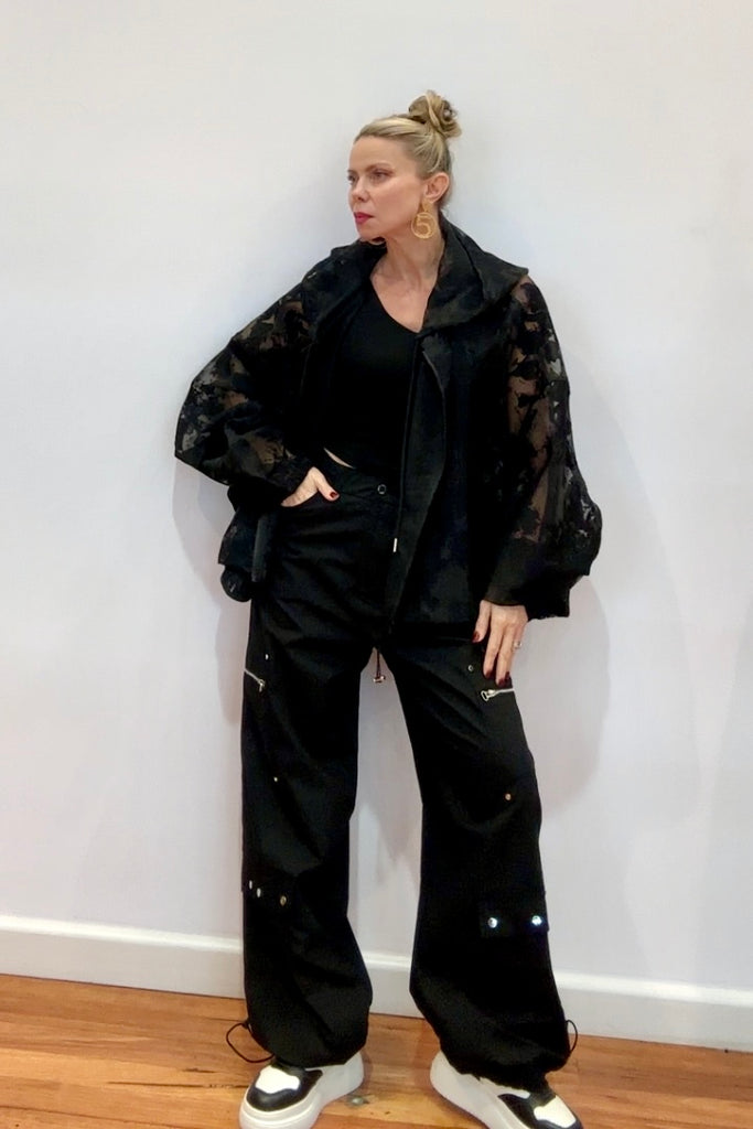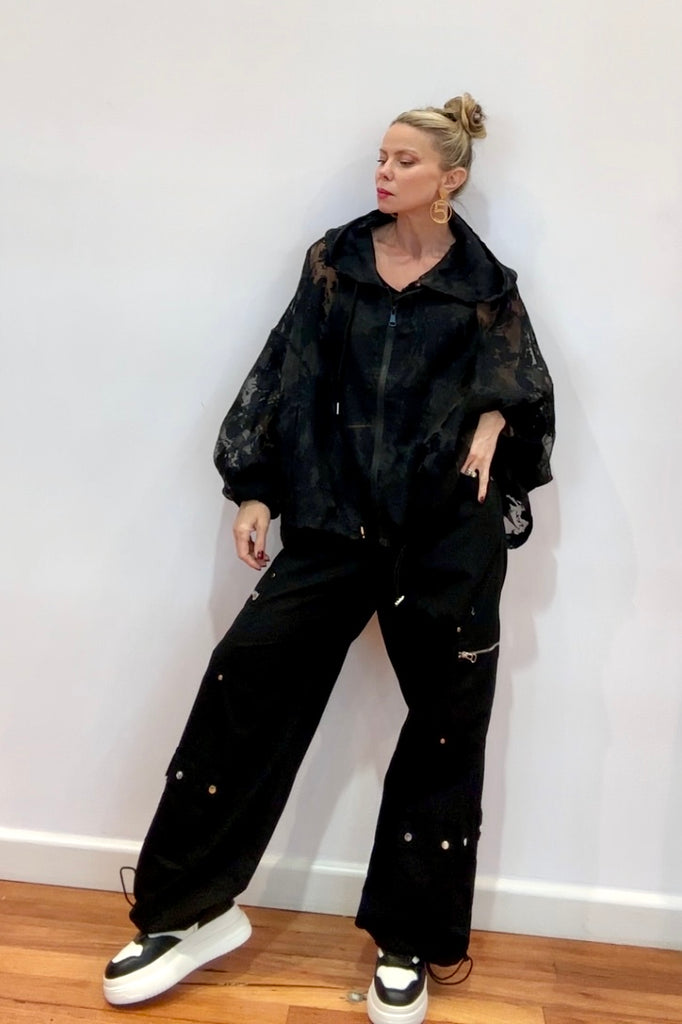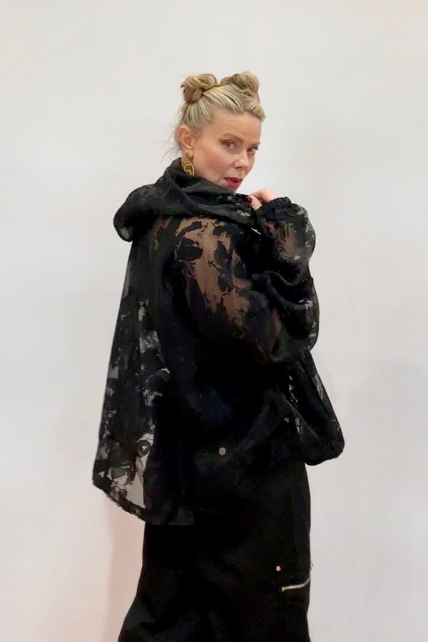 A moody mix of texture and transparency, the Midnight Sheer Oversized Jacket brings an elevated edge to modern streetwear. Designed with a sheer burnout floral effect and relaxed silhouette, it blends femininity with street-style cool. The voluminous balloon sleeves, drawstring hood, and zip-up front make it effortlessly wearable while still delivering high-fashion drama.