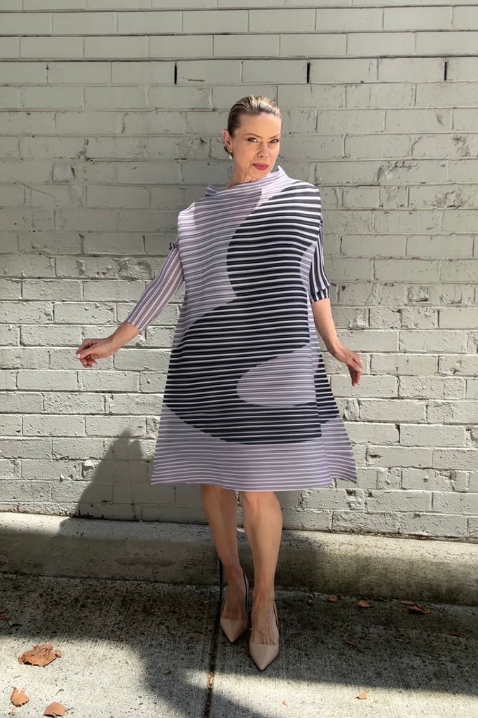 Elegant in vogue pleated dress in artsy mixed colour to add that extra flare! The dress is cut asymmetrically with an high neck and three quarters sleeves . Wear it with your favorite heels or use it casually with a gorgeous flat summer sandal.